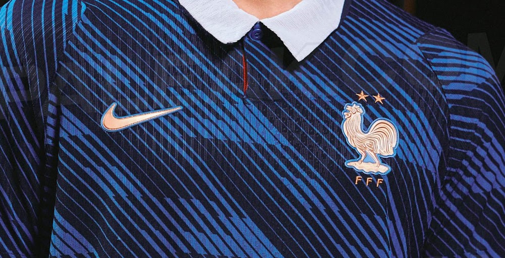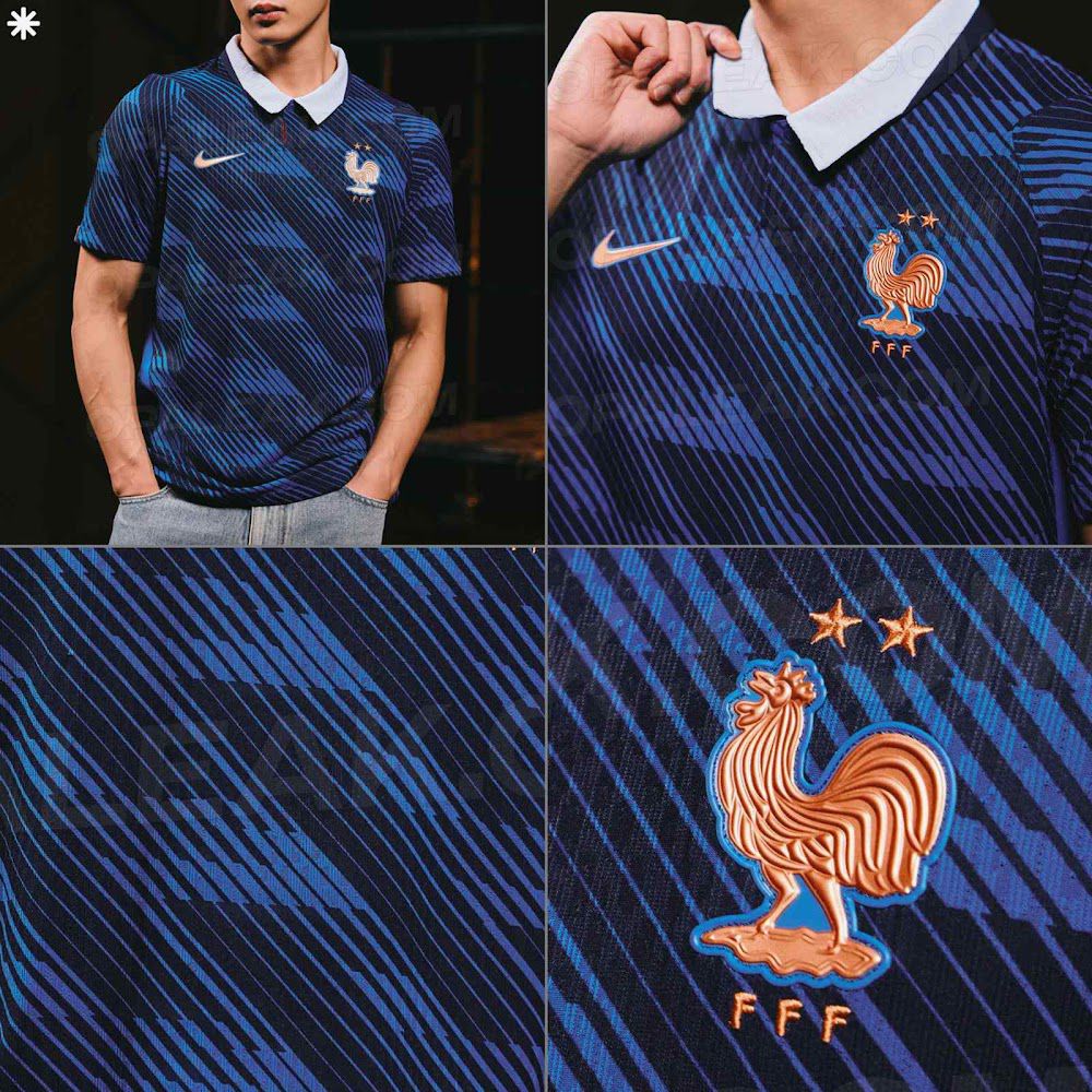 队服整体采用深蓝色全身图案,融入法国足协(FFF)元素。领口为现代化Polo领,前部为白色,背部过渡为深蓝色,领口闭合处隐藏红色细节。