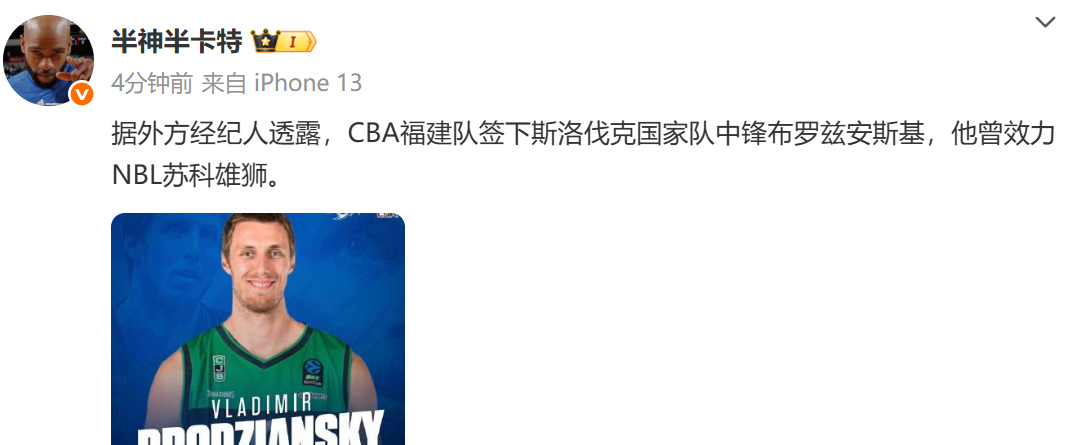 6686体育11月5日讯 据国内媒体人“半神半卡特”报道,据外方经纪人透露,CBA福建队签下斯洛伐克国家队五号位布罗兹安斯基,他曾效力NBL苏科雄狮。