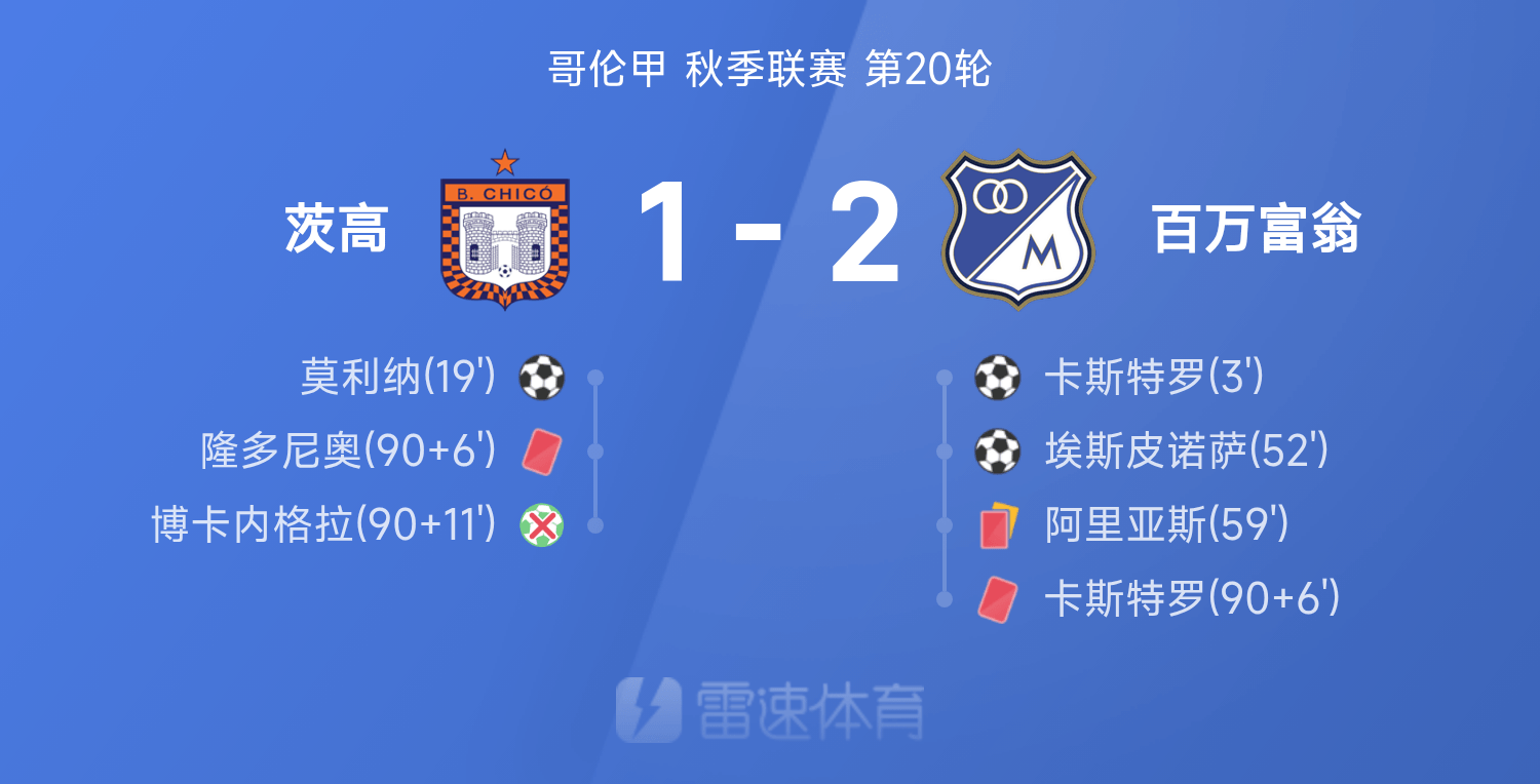 6686体育官网11月13日讯 25赛季哥伦甲秋季联赛事第20轮,百万富翁2-1战胜茨高。全场竞赛,埃斯皮诺萨发挥出色贡献1射1传,卡斯特罗破门建功,莫利纳破门难救主,博卡内格拉在最后时刻读秒失点,卡斯特罗、隆多尼奥染红。