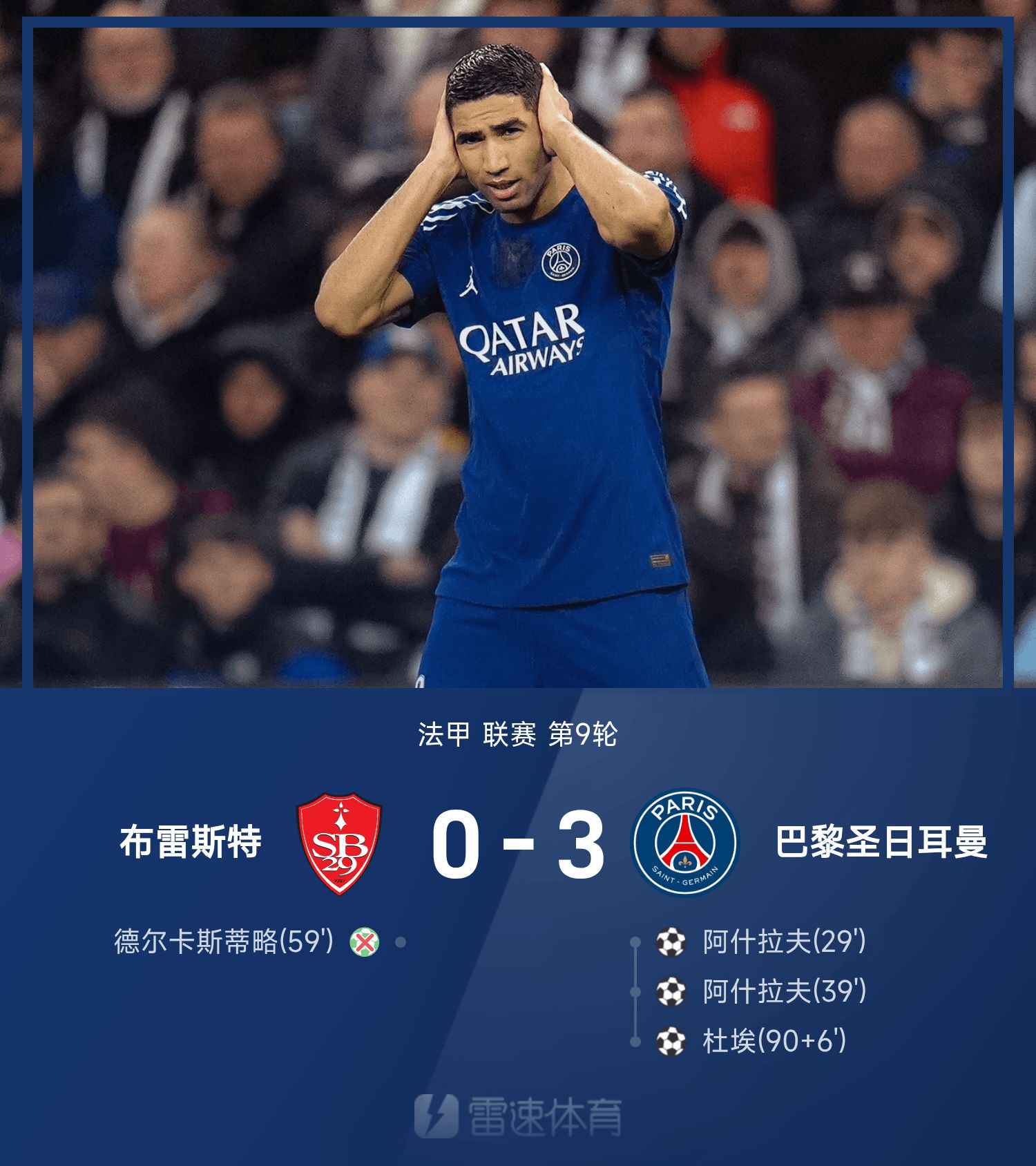 法甲战报:阿什拉夫双响,德尔卡斯蒂略失点,巴黎3-0布雷斯特