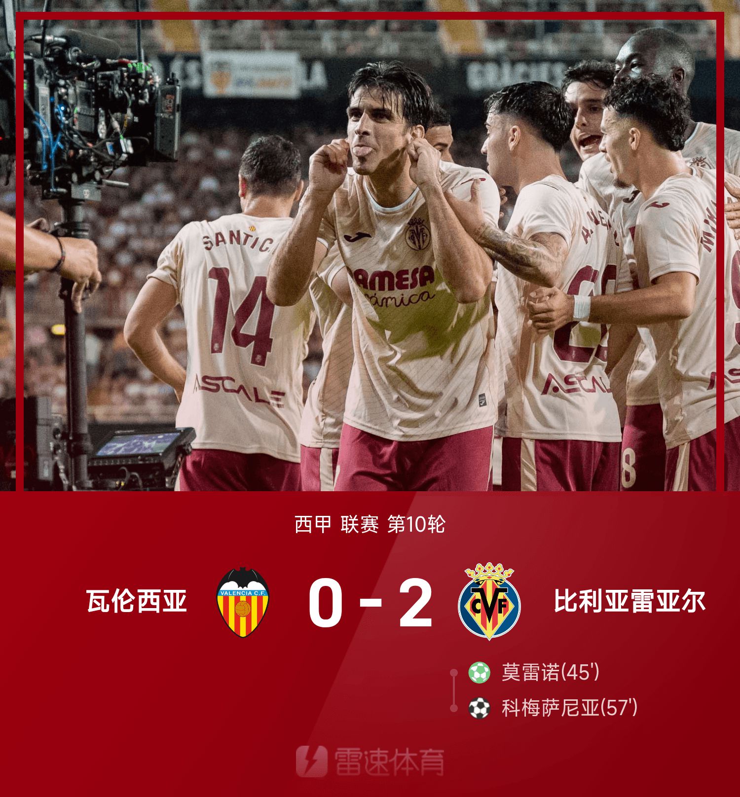 6686体育官网10月26日讯 25/26赛季西甲联赛事第10轮,比利亚雷亚尔2-0战胜瓦伦西亚。第45分钟,莫雷诺造点并亲自主罚命中,300场里程碑破门;第57分钟,科梅萨尼亚跟进射门破门锁定胜局。