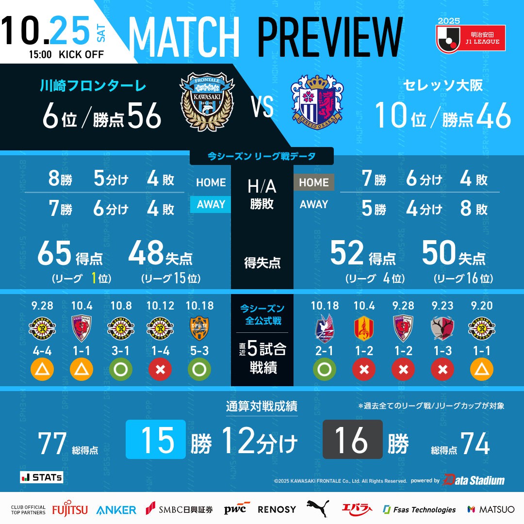 6686体育官网10月25日讯 日职联第35轮,大阪樱花主队场迎战川崎前锋。