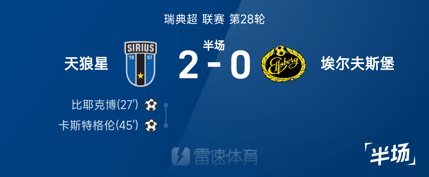 瑞典超半场:比耶克博破门,天狼星2-0埃尔夫斯堡