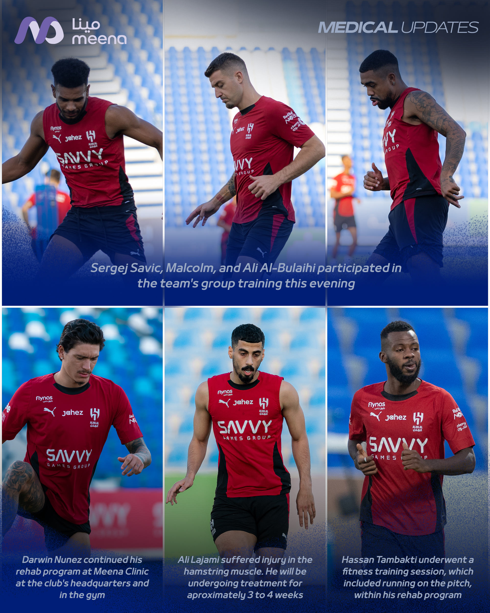 新月官方:马尔科姆、米林回归合练,努涅斯仍在进行恢复健康练习