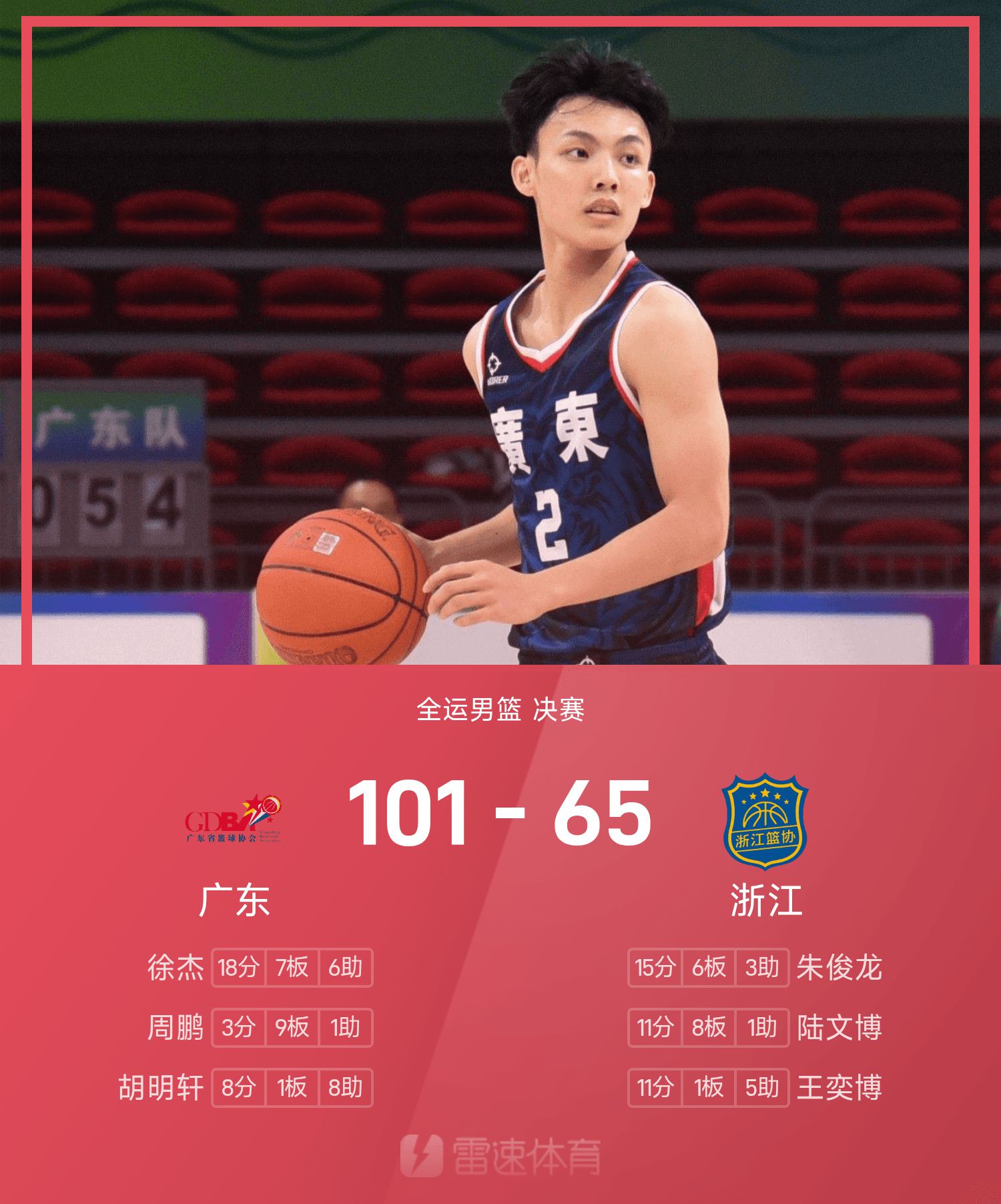 徐杰砍下全场最高的18分7板6助,赵睿13分4抢篮板5助攻,率领广东胜利取胜,夺得本届全运男篮金牌。