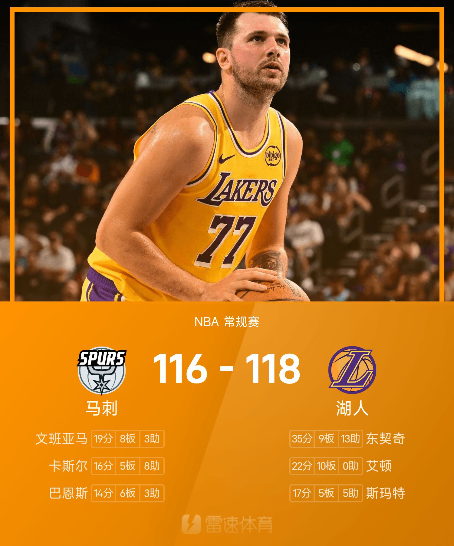 NBA战报:东契奇35分9板13助,湖人118-116险胜马刺