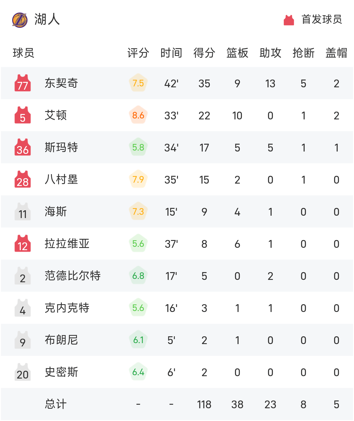 东契奇砍下全场最高的35分9板13助,率领湖人胜利取胜。