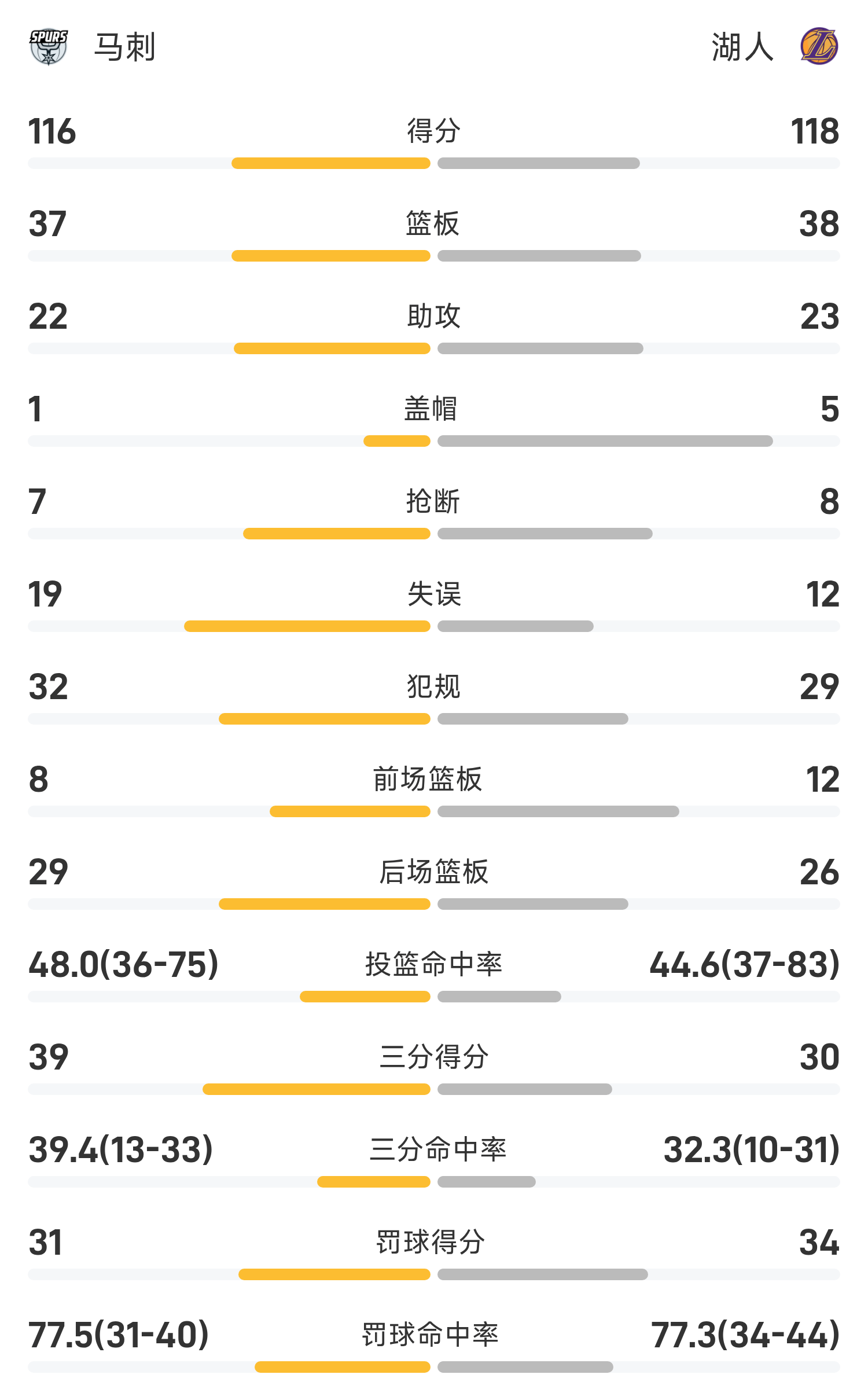 双方全场战罢,湖人118-116战胜马刺。